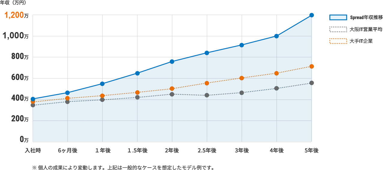 他社の年1〜2回の評価とは違い、Spreadでは毎月評価・毎月昇給のチャンスがあります。頑張った分だけ、その月のうちに給与アップ。成果と報酬の完全連動で、モチベーションを保ち続けられます。